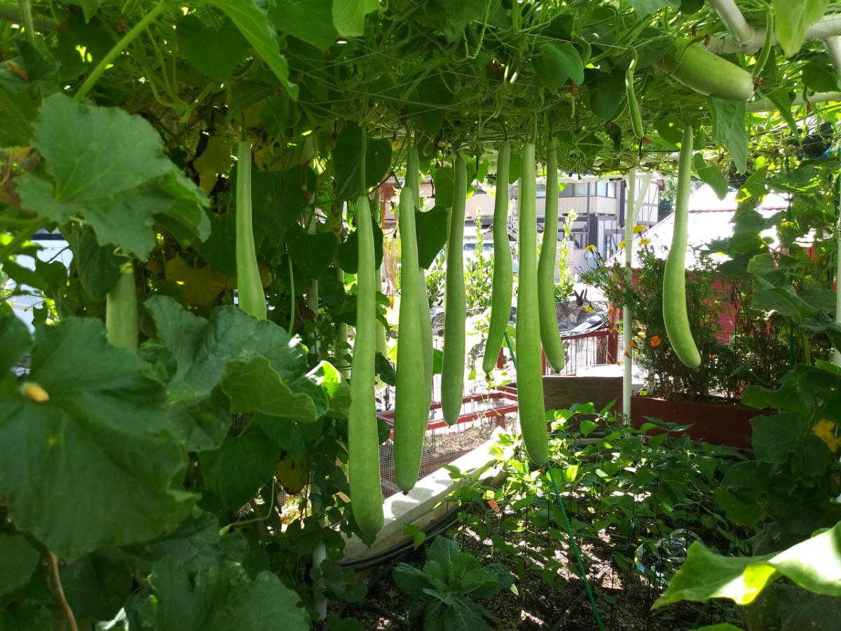 Four-dimensional farming uses heat tolerant species to create cool micro-climates for heat sensitive plants to allow them to survive and thrive. Thus, vining, heat-loving, plants are directed to the trellis level where they can spread horizontally in full sun (or 80% full sun from the shade cloth layer). Example vines this year include Cuccuzza, Trompetta, Iranian, and Kombucha squash, Tomatoes and Cucumbers, Netted Melon (also cantaloupe) and Bitter Melon, Luffa gourd, and Pole beans. More on trellis farming in a future musing.